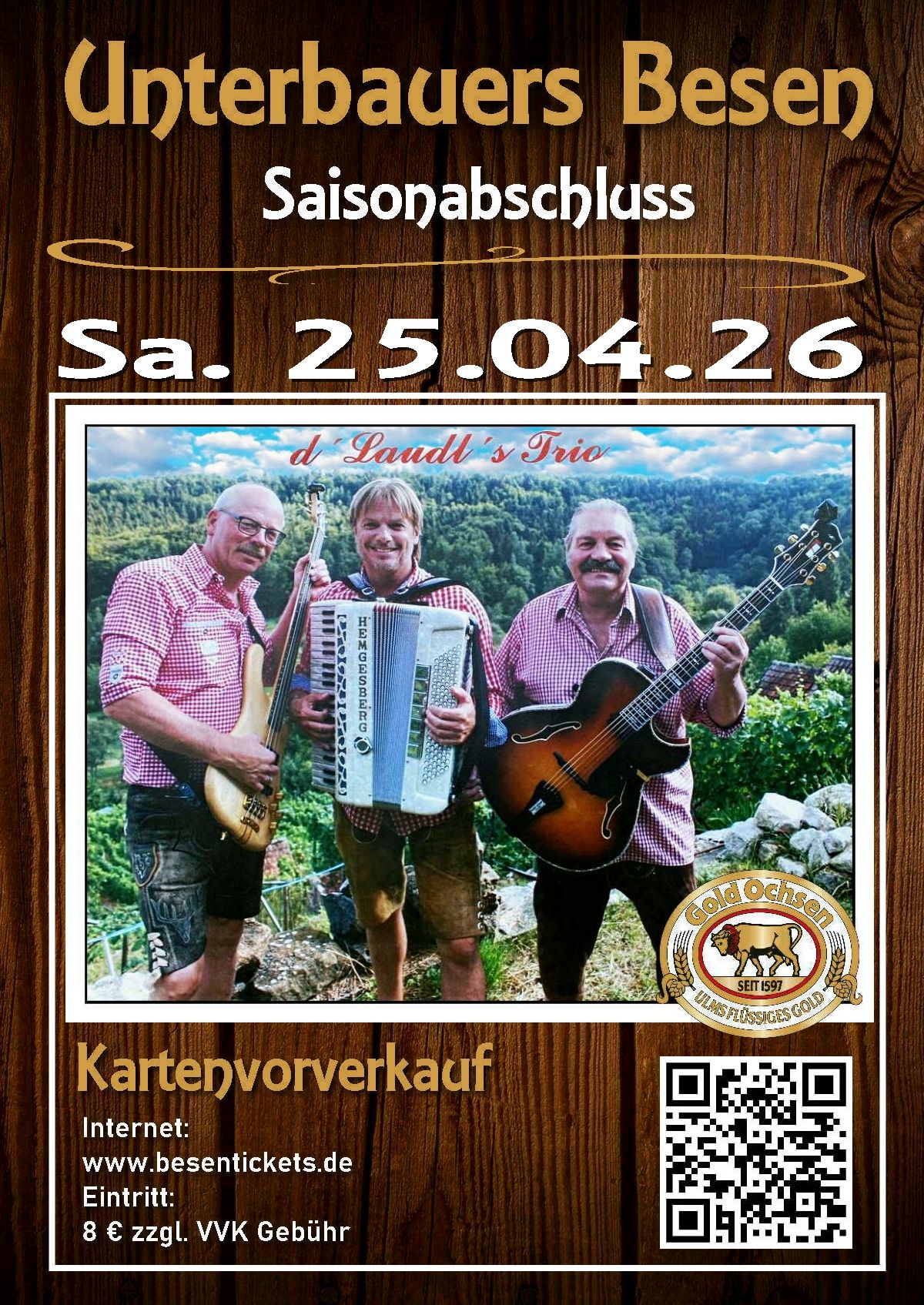 Buy tickets online. Advance sale from 20.01.2026 till 23.04.2026 Tickets for d´Laudl´s Trio | Saisonabschluss |Stimmungsabend im BesenUnterbauer´s Besen in 73312 WaldhausenAdmission at 16:00 o'clock